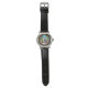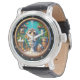 Esta imagem é um WATCH circular com uma borda preta e números brancos, com uma ilustração caprichosa de um marisco laranja com aspecto chocado vestindo óculos de ronco e lendo um jornal. enquanto sentado em um banheiro. A cena é colocada debaixo d'água com paredes azuis, algas, estrelas e um cavalo marinho. As bolhas flutuam em torno do caractere peculiar, todas fechadas dentro de um quadro interno do ouro.