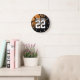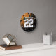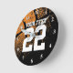 Relógio de basquete laranja redondo com número de camisa desportiva personalizada. O esporte legal temia a decoração doméstica para crianças, quarto, mancaverna, bar, etc. Design personalizável com nome de equipe personalizado, citação engraçada, slogan etc. Cor de fundo personalizável. Adequado para homens, mulheres e crianças adolescentes (rapazes e raparigas). Ideias personalizadas de presente de aniversário para jogador, treinador e fã.