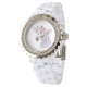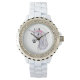 Um relógio monocromático balbucioso com banda branca e detalhes cintilantes. Os destaques são as intrincadas cores design e vibrantes, enquanto a iluminação macia e difusa melhora seu encanto.