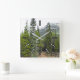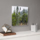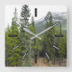 Este design de relógio quadrado mostra uma foto de uma cena de floresta com árvores coníferas, junto com uma montanha ao fundo. Também apresenta retângulos que marcam as horas.