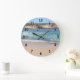 Relógio com foto de fundo de ondas quebrando em uma praia e penhascos ao fundo