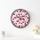 Este relógio de parede é feito com uma impressão de cereja com uma borda de verificação em preto-e-branco.
