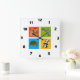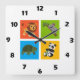 Este relógio de parede mostra uma coleção de bébés fofos sobre quadrados laranja, azul verde e amarelo neste estilo e tema do zoológico. Este relógio é feito para qualquer parede e impresso com um processo AcryliPrint®HD e feito de acrílico de grau A. A bateria é acionada com uma bateria AA apenas para uso interno, não recomendada para uso no exterior.
