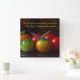 Foto macro de tomate vermelho e verde sobre fundo mudo em tons de marrom e cinza. A citação está em um script ouro amarelo e diz: "Os melhores momentos sempre são encontrados quando amigos e familiares se reúnem." Bela peça de decoração da cozinha!