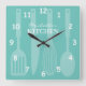 Relógio de cozinha personalizado com utensílios de cozinhar Teal / azul-turquesa e cor de fundo branca ou personalizada. Ótima ideia de presente de decoração para a mãe, pai, mãe, tia, irmã, filha, esposa, amiga, etc. Espátula de faca de punho e uísque com número e nome personalizado. Versão quadrada ou redonda.
