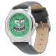 Um relógio de criança engraçado com design de desenho animado de monstro verde. Relógios de pulso personalizados para crianças. Ideia exclusiva de presente de aniversário para meninos e meninas. Criar um para filho especial, neto, sobrinho, irmão mais novo, irmão mais novo, irmã, filha, neta, primo mais bonito, amigo, filho, neto, irmãzinha ou irmã mais velha, etc. Design de desenho animado com números. Também é bom como presente de Natal para os Feriados. Inclui banda a preto. Grandes olhos e cheio de boca de dentes afiados.