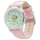 Um relógio de criança com um belo desenho de abelha. Relógios de pulso personalizados para crianças. Aniversário feminino ou ideia de presente de Natal para meninas. Design de vetor animal selvagem. Faça seu próprio cronista para filha, neta, netos etc. Adicione o seu próprio nome personalizado ou letras monográficas de criança. Padrão de fundo das Bolinhas verdes. Modelo de tipografia divertida. Banda de couro rosa.