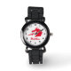 Um relógio de criança com design de logotipo da cabeça de dragão vermelho. Relógios de pulso personalizados para crianças. Ideia única de presente de aniversário para meninos. Crie um por filho, neto, sobrinho, irmão mais novo, irmão mais novo, irmão, primo, amigo, filho, neto, etc. Também excelente como presente de Natal para os Feriados. Inclui banda de silicone de borracha a cores pretas. Legal desenho da criatura fantasma cuspindo chamas.