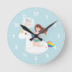 Olá, verão! Um relógio de parede com ilustração de um flutuador de piscina unicórnio fofo que tem mana e cauda arco-íris. Uma garota alegre está cavalgando um picolé de sorvete na mão.