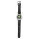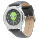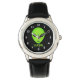 Relógio de desenho animado Alien verde personalizado com o nome ou monograma da criança. Design de relógio de tema espacial fofo para meninos em festa de aniversário. Faça um para filho, neto, novo bebê, neto, etc. Ilustração de forma de vida extraterrestre para crianças.