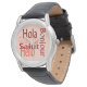 Diga Olá em cinco idiomas com um legal design avermelhado. Este relógio é perfeito para um olhar esportivo de na moda.