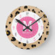 Um relógio com ilustração de um círculo cor-de-rosa no centro. O fundo é o padrão de impressão leopardo. Numerais são cor-de-rosa e pretos. Personalize com seu nome e inicial.