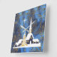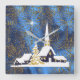 Relógio de Natal com uma silhueta antiquada de uma igreja na neve na véspera de Natal e galhos de árvores espumantes ao redor. Decorar com um tema religioso moderado e antigo este Natal com este relógio com uma pintura azul-escura, branca e dourada de uma noite de Natal estrelada. Perfeito para um tema "Noite Silenciosa".