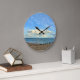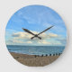 Parte da Coleção Costeira do Escopo do Foto. Uma praia de seixo deserta, com mar calmo e nuvens brancas contra um céu azul, é representada neste relógio de parede acrílico. Fornece um sotaque colorido contra uma parede branca ou escura em qualquer sala.