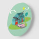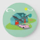Este padrão de Relógio de Parede Acrílica da Casa Suburbana apresenta uma típica casa Americana em um típico bairro Americano, por volta de 1950. Uma casa de chá com um telhado azul de pavão, e janelas de turquesa são perfeitamente compensadas por uma porta vermelha vibrante e porta de garagem. Um carro convertível clássico, cor-de-rosa, da década de 1950, está estacionado na passarela pitoresca. Kitschy, plástico, flamingos cor-de-rosa olham bem em casa na forma de bumerangue de grama verde recém-aparada descansando sobre um fundo de jade. O relvado manicurado é paisagístico com árvores brancas. Nuvens em forma de feijão e uma explosão de sol amarela de um sol que vos permite saber que é apenas mais um glorioso dia nos subúrbios modernos do meio século.