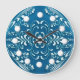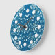 Relógio de parede azul e branco, com um design de rolagem que se assemelha à cobertura do cookie.