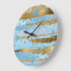 Relógio de parede glamouroso feito em uma folha azul e dourada e padrão de faixa de abstrato com aspecto brilhante. Os números azuis das horas 12, 3, 6 e 9 decoram o perímetro do relógio. Personalize para adicionar qualquer texto que você quiser.