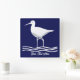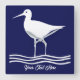 Relógio personalizado da parede quadrada de pássaros. Pássaro do mar em terra com um campo de texto no centro. Azul e branco.