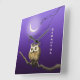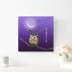 Uma coruja marrom com olhos brilhantes sentados em um galho sob a luz da lua. Céu azul profundo, lua brilhante. Nome personalizado, fonte caligráfica. A coruja é um trabalho de arte derivado baseado em um impressão japonês de colheita no início dos anos 1900 (abrigado em Rijksmuseum).