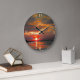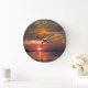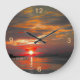 Relógio de parede com um lindo pôr do sol editado nas cores de cinzas vermelha, laranja, cobre, amarela e escura.