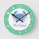 Relógio da parede da enfermaria com caranguejo azul e nome do bebê. Boa ideia para o quarto de crianças. Condecoração de viveiros azuis e verdes com nome personalizável. Cartoon de animais de Sealife.