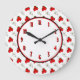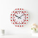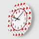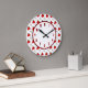 Um relógio de parede retrógrado da cozinha com um padrão de fundo de morangos vermelhos e flores brancas de morango com rosto branco e letras vermelhas e pretas. Clique em Personalizar para adicionar seu nome ou mensagem, alterar as cores de fundo e muito mais.