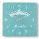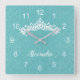 Este relógio de parede é impresso com uma linda imagem de tiara rabiscada sobre um fundo azul claro, de padrão brilhante. Ele tem números brancos simples, fáceis de ler e um nome personalizado. Agradeça a qualquer menina que ama temas da princesa. Sua escolha de quadrado ou redondo.