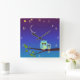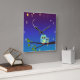 Uma coruja com ela é pequena sob um céu de estrelas cintilantes. Arte original da Menagerie da Night Owl, 2010.