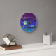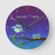 Duas corujas bebês se abraçam e se acomodam para dormir sob um céu de estrelas cintilantes enquanto a mãe coruja sobre elas. Fácil de personalizar ou limpar o texto apenas para trabalho de arte. Este design funciona para relógios de médio e grande porte. Arte original da Menagerie da Night Owl, 2010.