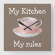 A parede da cozinha é recheada com palavras engraçadas, combinação de cor rosa e marrom com o gráfico de uma bela xícara de chá em segundo plano e o slogan humorístico da cozinha My Kitchen My Rules em texto ousado que permite a todos saber que é a sua cozinha com caráter e estilo.