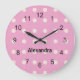 Relógio de mulheres ou raparigas na parede, em modelos de bolinhas rosas, brancas e pretas. Personalize o texto opcional no editor fácil do Zazzle