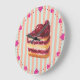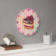 Whimical, retro inspirado, design apresenta fatia de bolo de camada de cereja sobre fundo listrado com fundo rosa de relógio cardíaco