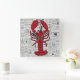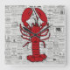 Relógio de parede com imagem de lagosta contra papel de jornal preto e branco.