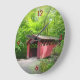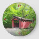 Este relógio de parede apresenta uma ponte coberta vermelha no Parque Estadual Chatfield Hollow, em Killingworth, Connecticut.