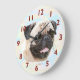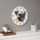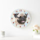 Um desenho digital de um Pug. Esta obra artística de Diane Blackman é baseada em uma fotografia. É um jovem Pug com uma expressão feliz. O fundo é uma espiral de cores pastéis com textura mosaica. Os números do relógio são um castanho avermelhado escuro.