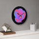 Este relógio incrível apresenta uma bela fotografia de uma tulipa. A fotografia foi colorida artificialmente, resultando numa tulipa fluorescente. As pétalas exteriores são coloridas com tons azuis e vermelhos, enquanto as pétalas interiores apresentam tons de rosa e roxo. O centro da flor é amarelo claro. O simples fundo preto mostra a beleza impressionante desta flor.