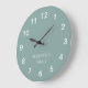 Este relógio de parede minimalista pálido e personalizado moderno é fácil de personalizar digitando seu nome de família ou texto similar na modelo de personalização antes de fazer pedidos. O design apresenta os números e a personalização em branco sobre um simples fundo de cor de turquesa simples e pálida, para que o tempo possa ser facilmente visto por adultos e crianças.