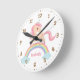 Uma peça de relógio com um unicórnio pequeno fofo e bonito com cabelos encaracolados rosa exuberantes no topo de uma ponte de arco-íris entre duas nuvens. Personalize com o nome da menina para uma peça decorativa de quarto única. Números de relógio fáceis de ler.