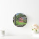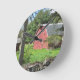 Este relógio de parede apresenta um celeiro country vermelho em Connecticut. Ótimo para decoração rústica!
