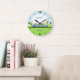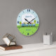 Este relógio de parede dos meninos apresenta um ursinho giro dirigindo um trem azul, amarelo e vermelho em um cenário no país. Está pronto para ser personalizado e é adequado para o berçário ou quarto de um menino.