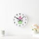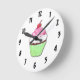 Um bonito relógio para a cozinha. Ele apresenta um cupcake de desenho verde e rosa no centro.