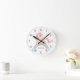 Uma peça de relógio com um pequeno unicórnio fofo e bonito, com cabelo rosado e roxo em cima de uma ponte arco-íris através de duas nuvens. Personalize com o nome da garotinha para uma peça decorativa de quarto única. Número de relógio fácil de ler.