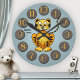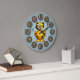 Um relógio de parede para o quarto de uma criança com números extras grandes para ajudar a aprender a ler o relógio. Este relógio apresenta uma imagem de tigre gigante em cores quentes de ouro em um fundo azul de aço.
