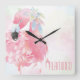 Bonito relógio de parede tropical com trabalho de arte de aquarela de um flamingo cor-de-rosa, com penas decorativas pastel na cabeça, contra fundo pastel. O texto cor-de-rosa lê Flamingo e pode ser personalizado para ler o que você quer. Bonita peça decorativa de parede de sotaque.