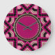Padrão geométrico de retalhos em tons cor-de-rosa e preto. Correspondência do círculo central rosa quente com os ângulos dourados para melhorar as mãos do relógio e também o espaço perfeito para você personalizar com texto, se desejar.