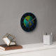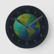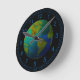 Este gráfico de um globo está em blues e verdes e é colocado sobre um fundo preto. A face do relógio está no mesmo azul que a água do globo.