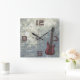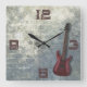 Relógio quadrado com guitarra e design de grunge. Fundo de cinzas, aflitos, com uma imagem vermelha escura, de guitarra. Os números 3,6,9 e 12 em vermelho escuro são modelos e podem ser removidos. Este relógio de música funciona bem em um quarto de meninos adolescentes, ou sala de música.
