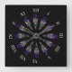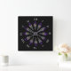 Um adorável padrão de vidro manchado enfeita este relógio de parede em cores dominantes de roxo, azul, amarelo e preto. Doze penas abstrato circulam uma máscara central para formar uma design de mandala espiritual com uma sensibilidade Nativa Americana. Os algarismos romanos acrescentam uma sensação medieval ou renascentista.