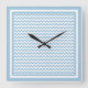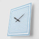 Um relógio de parede na moda quadrado, com um padrão de cavaleiros azuis e brancos.