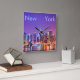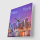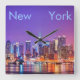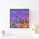 Um relógio de parede quadrada com o horizonte iluminado da NYC seguido do texto.